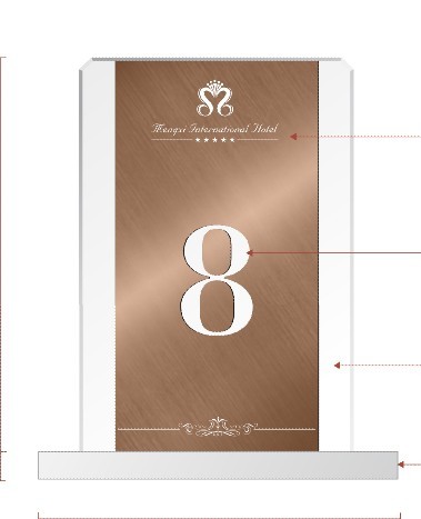 大家可以看到這個(gè)酒店餐臺(tái)座,簡(jiǎn)單的給大家介紹下制作規(guī)范:牌上面印有酒店logo是采用絲印銀色,牌上的序號(hào)數(shù)字制作材質(zhì)是用3mm厚斜紋細(xì)拉不銹鋼,工藝上電鍍咖啡金色、文字鏤空、打磨拋光,亞克力底座使用打磨拋光制成。可以了解到一個(gè)小小餐臺(tái)座設(shè)計(jì)師也是很用心為酒店設(shè)計(jì)制作的,不僅僅要讓酒店滿(mǎn)足還要讓更多的客戶(hù)喜歡。